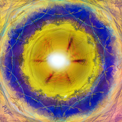 The Visual Mantra Collection is mandala-themed art created with specific healing intent. This artwork shares a circle within a square format and is designed to allow your eyes to wander but always draws them back to center, like the way a mantra focuses your mind in meditation. Sacred geometry and numerological elements, as well as color, symmetry and repetition, are used to “tune” each painting to promote balance in specific energy fields in the human body. Subtle interplay of these elements creates a different experience for every viewer, and each viewer can experience something new every time they interact with the artwork. Please enjoy our original music as you work with each Visual Mantra.